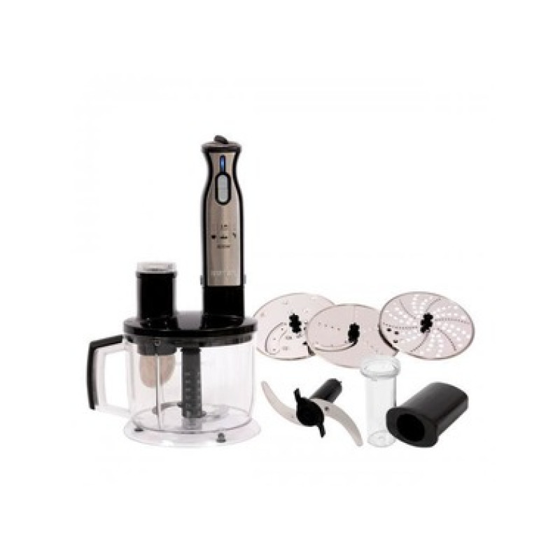 Опис:Тип: занурювальний блендер. Потужність 1000 Вт. Кількість швидкостей: 2. Функції та можливості: збивання, подрібнення, змішування, шаткування.