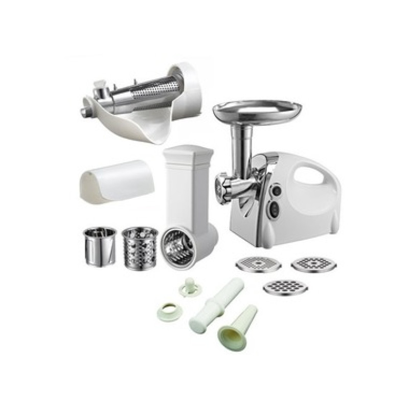 Опис:Потужність м'ясорубки 1500 Вт. Система реверсу: є. Кількість грат: 3 у комплекті, діаметр отворів 2 мм, 5 мм, 7 мм. Насадки-шатківниці: є. Насадка для приготування: є. Насадка "кеббе": є. Насадка для томатного соку.