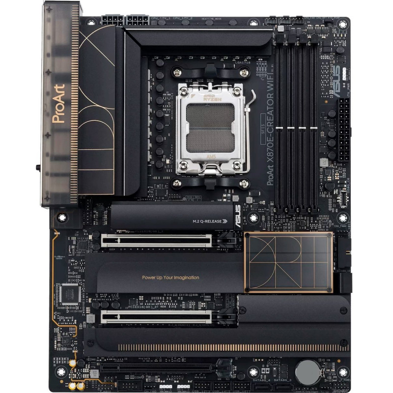 ProArt X870E-Creator WiFi розширює можливості творців контенту всіх рівнів, максимально збільшуючи продуктивність найновіших процесорів AMD Ryzen серій 9000, 8000 і 7000 з 16+2+2 каскадами живлення, слотами DDR5, PCIe 5.0 і блискавично швидким підключенням, включаючи два USB4,.